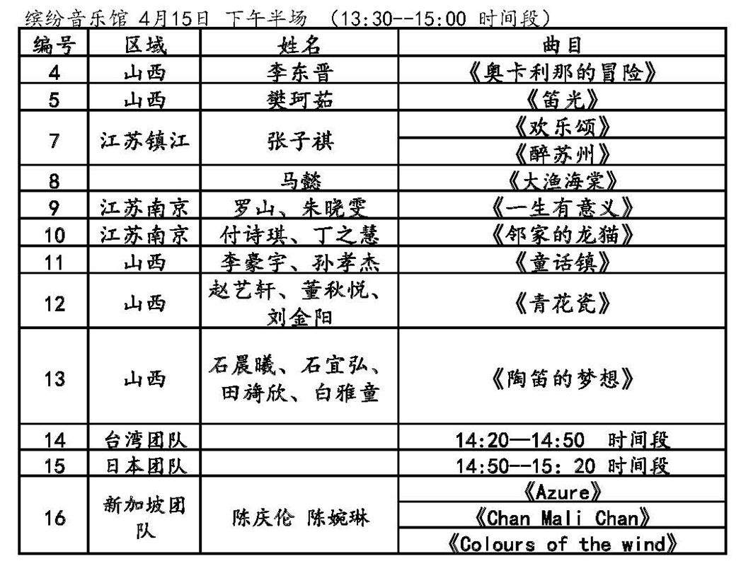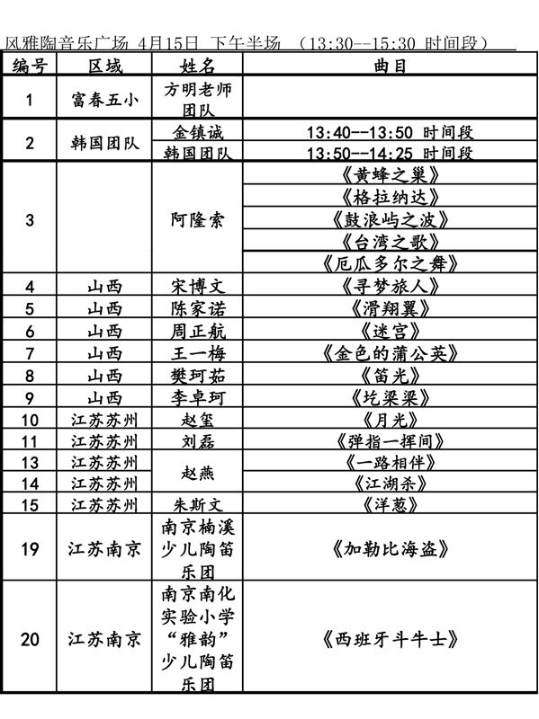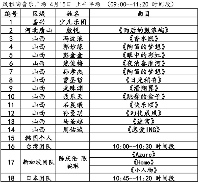 第九屆風(fēng)雅陶笛節(jié)活動日程4月14日表演節(jié)目單及時間繽紛音樂館風(fēng)雅陶音樂廣場4月15日表演節(jié)目單及時間繽紛音樂館風(fēng)雅陶音樂廣場